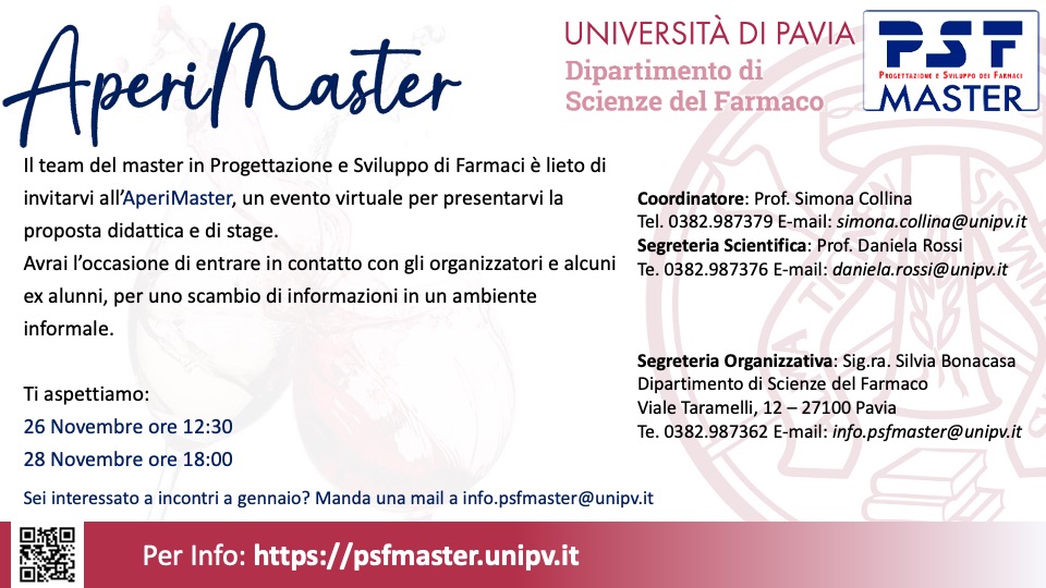 Il Master in Progettazione e Sviluppo dei Farmaci (Master PSF), nato nel 2002, è il Master di II livello che permette di acquisire e sviluppare le competenze e le abilità necessarie per una carriera in aziende e centri di ricerca che operano in ambito farmaceutico e in particolare in ricerca e sviluppo del farmaco. Si rivolge a giovani laureati e a professionisti del settore che intendono investire in una formazione di alto livello. L’impostazione interdisciplinare permette di acquisire una formazione di eccellenza che consentirà di operare a vario titolo nel settore del farmaco.